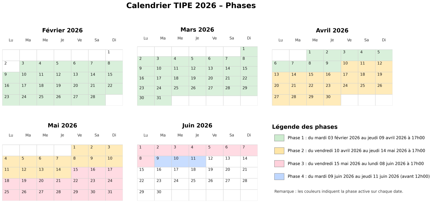 Ce calendrier synthétise les phases officielles du TIPE 2026. Chaque phase est représentée par une couleur distincte afin de faciliter la lecture et le suivi des échéances. Les périodes s’étendent de la Phase 1 jusqu’à la Phase 4, avec les dates de clôture indiquées à 17h00 (phases 1 à 3) et une contrainte spécifique avant 12h00 pour la phase 4. Ce visuel permet aux candidats d’organiser leur travail, d’anticiper les étapes et de respecter les délais..