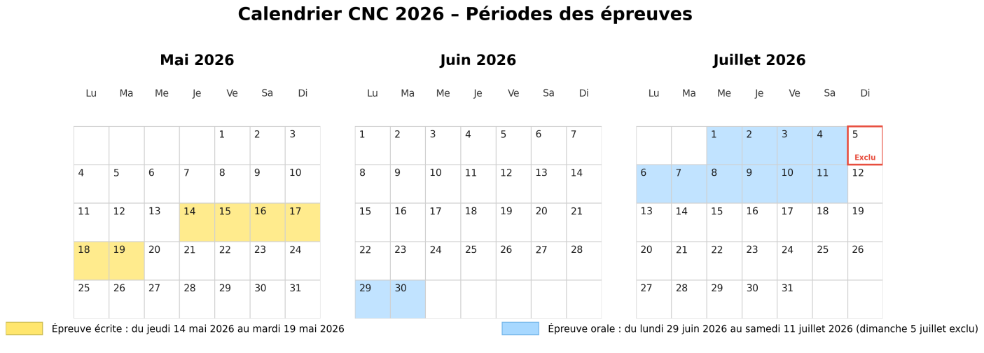 Ce calendrier présente les périodes officielles du CNC 2026. Les épreuves écrites se déroulent du jeudi 14 mai au mardi 19 mai 2026. Les épreuves orales auront lieu du lundi 29 juin au samedi 11 juillet 2026, avec exclusion du dimanche 5 juillet 2026. Les dates concernées sont clairement mises en évidence afin de faciliter la lecture et l’organisation des candidats.